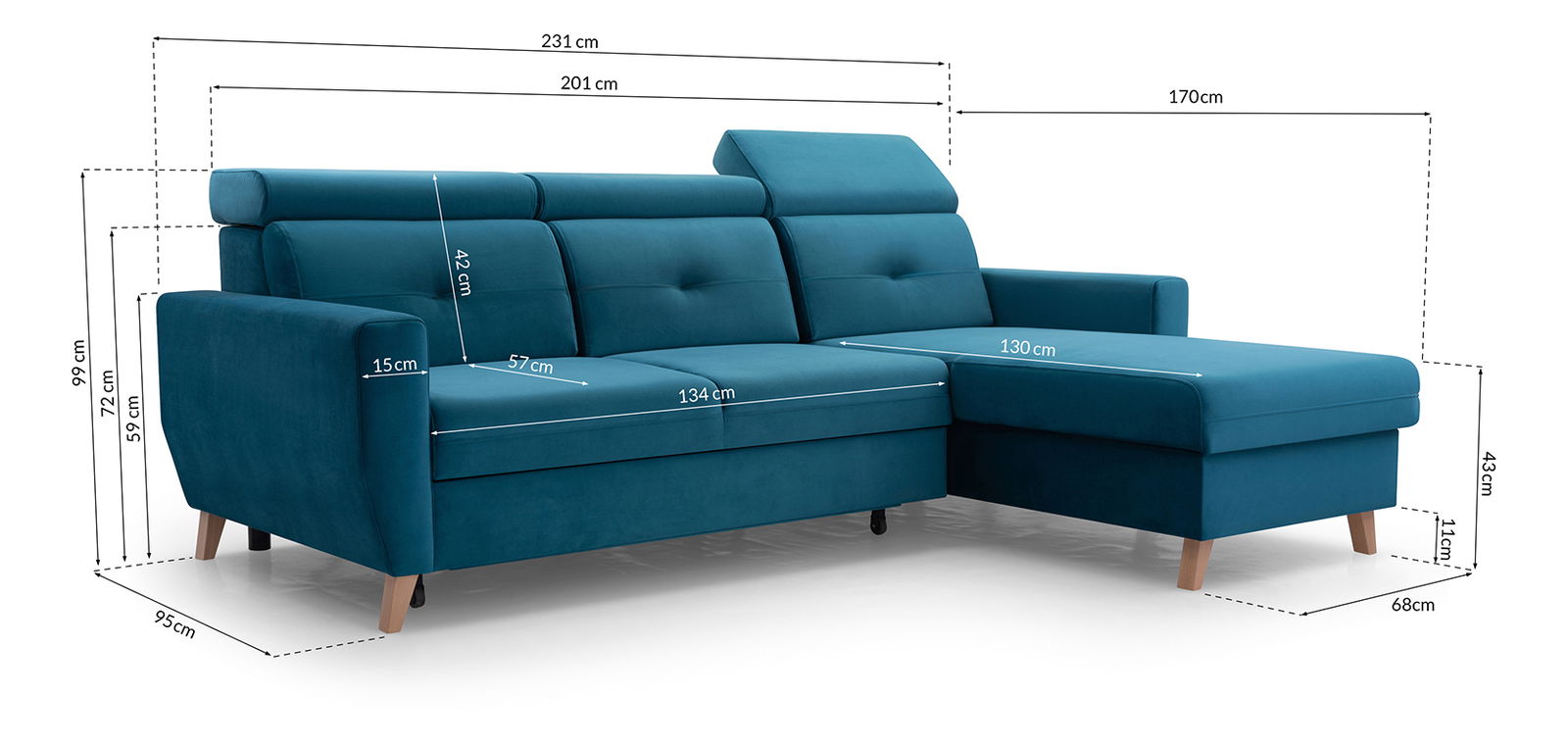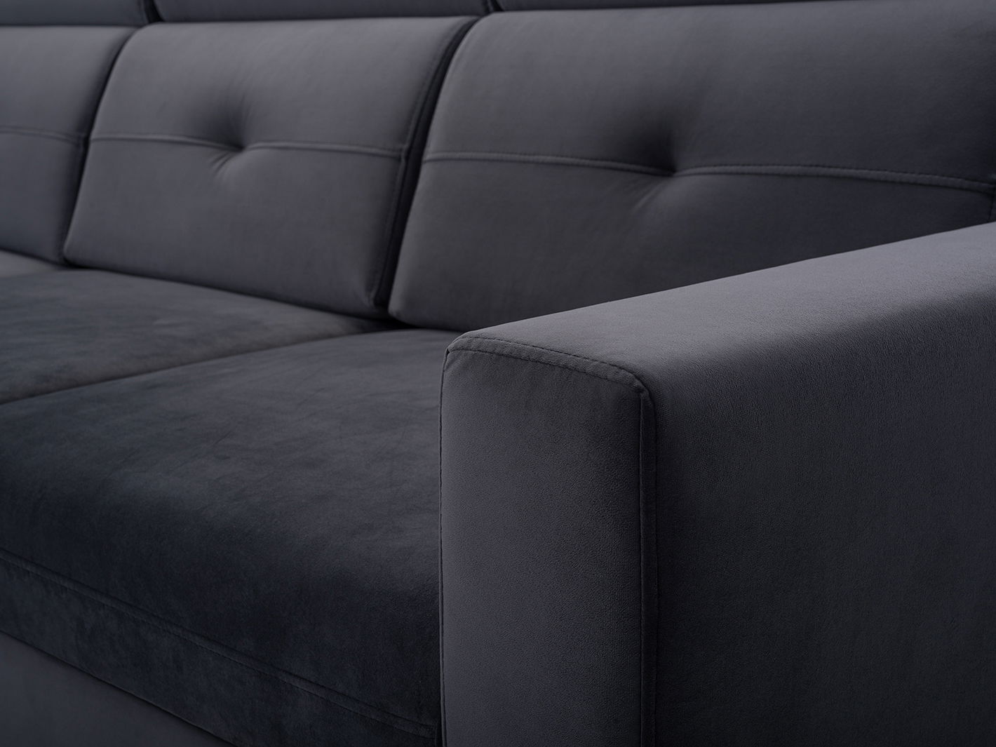 ZobrazitSanfew rohová sedačka v tmavě šedé barvě o výšce 99 cm a hloubce 170 cm je vyrobena z příjemné velurové látky ve více barevných provedeních. Sedačka má jednoduchý tvar a je vhodná do každého obývacího pokoje. Zaručuje extra pohodlí díky velké užitné ploše a pohyblivým opěrkám hlavy. Krásně prošívané zádové polštáře a naturální dřevěné nožičky přidávají sedačce na stylu. Tkanina Bluvel je hustá nábytková látka velurového typu, mimořádně jemná a sametová na dotek. Potahová látka je velmi odolná proti oděru a její speciální úprava Water repellent a Pet friendly chrání látku před rychlým absorbováním tekutin. Sedačka má test oděruvzdornosti Martindale 50 000 oděrů. Výplň sedáku je z pěny PU a pružiny faliste, výplň opěradla je z pěny PU. Opěradlo je čalouněné a sedačka má ozdobné prvky. Výška lůžka je 43 cm, výška korpusu (zadní části) je 99 cm, výška sedu je 43 cm a hloubka sedu je 57 cm. Sedačka má dřevěné nohy v naturální barvě, je rozkládací a má jeden úložný prostor. Plocha spaní je 202x130 cm a sedačka má pohyblivé opěrky hlavy a funkci spaní „automat“. Je balena ve třech balících o rozměrech 134x76x95 cm/57 kg, 167x70x76 cm/38 kg a 95x30x48 cm/16 kg.