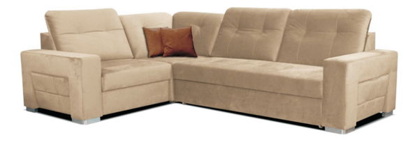 Rohová sedačka béžové barvy v provedení levý roh je ideální do větších obývacích pokojů, kde vynikne její designová jedinečnost a přitažlivý barevný odstín. Sedačka je rozkládací a úložný prostor se nachází v jednokřeslo (vyklápěcí sedák). Po rozložení se vytvoří rozměrná plocha na spaní. Sedák je vyroben z pružiny, čímž je zaručen komfort měkkého sezení a tvarová trvanlivost sedačky, rozměrné opěrky jsou regulovatelné. V balení dodává jsou dodávány 2 drobné polštáře v kontrastním barevném odstínu. Sedačka stojí na drobných širších nožičkách v šedé barvě.