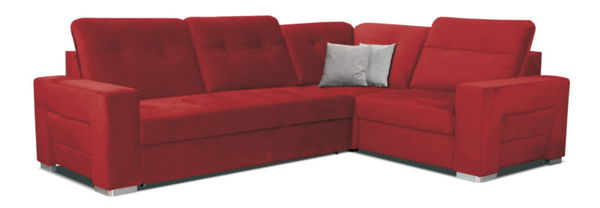 Rohová sedačka červené barvy v provedení pravý roh je ideální do větších obývacích pokojů, kde vynikne její designová jedinečnost a přitažlivý barevný odstín. Sedačka je rozkládací a úložný prostor se nachází v jednokřeslo (vyklápěcí sedák). Po rozložení se vytvoří rozměrná plocha na spaní. Sedák je vyroben z pružiny, čímž je zaručen komfort měkkého sezení a tvarová trvanlivost sedačky, rozměrné opěrky jsou regulovatelné. V balení dodává jsou dodávány 2 drobné polštáře v kontrastním barevném odstínu. Sedačka stojí na drobných širších nožičkách v šedé barvě.