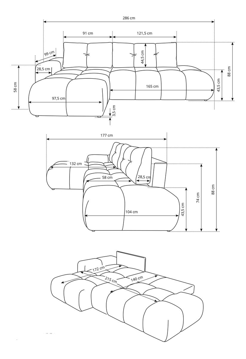 ZobrazitRohová sedačka s konstrukcí z borovicového dřeva a dřevotřísky je navržena pro pevnost a trvanlivost. Sedák je vyroben z PUR pěny T-3042 a T-2542, což poskytuje maximální pohodlí. Sedačka je rozkládací s plochou na spaní 140 x 215 cm. Výška sezení je 43,5 cm, hloubka sezení 58 cm a výška područky 58 cm. Sedačka má úložný prostor a záda potažená stejnou látkou, což zajišťuje jednotný vzhled. Nemá nastavitelné opěrky hlavy ani područky. Nožičky jsou plastové o výšce 3,5 cm. Typ rozkládání je DL automat, což umožňuje snadné rozkládání.