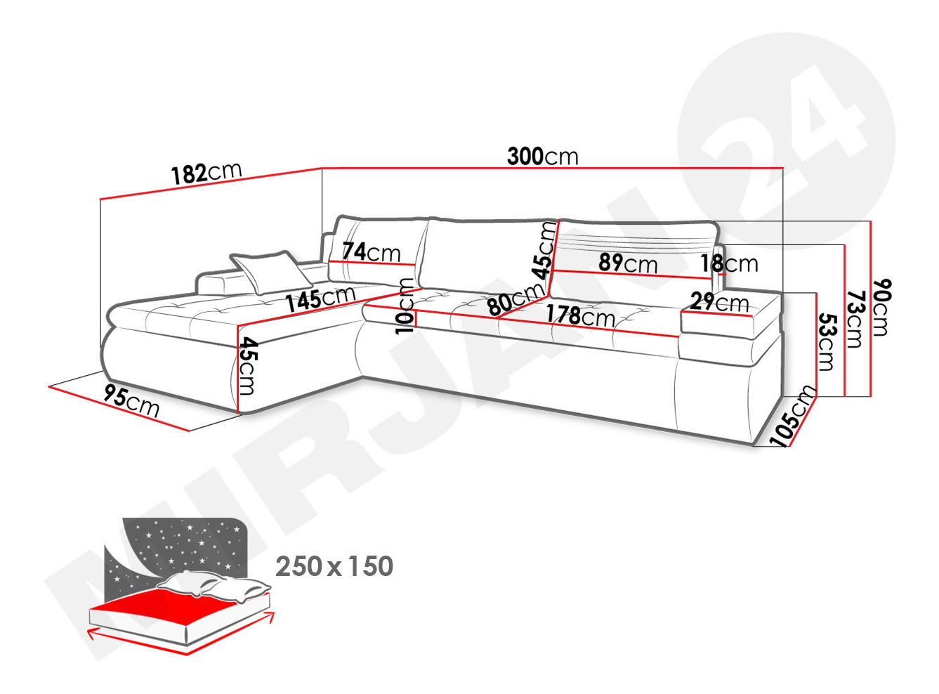 Rohová sedací souprava je ideální volbou pro ty, kteří hledají pohodlí a styl. Chcete si doma dobře odpočinout, a to i když nejste až tolik unavení? Rohová sedací souprava Sofia vám nabídne své náručí kdykoli budete chtít. Ať si relax zasloužíte nebo ne, její pohodlí vždy oceníte. Zkuste si ji rozložit na lůžko, budou se vám zdát krásné sny. Rozměry: délka: 300 cm šířka: 182 cm výška: 90 cm ložná plocha: 150x250 cm Barva: barevné provedení si vyberte zde Provedení rohu: levé nebo pravé Doplňující informace: úložný prostor: ano rozkládací: ano poloautomatické rozkládání polštáře pružiny volně stojící Záruční doba: 24 měsíců