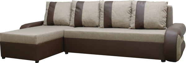 Příjemná rozkládací (univerzální roh) rohová sedací souprava dodávána s krásnými dvoubarevnými polštáři, jejichž hlavní funkcí je pohodlné opření na záda. Z designového hlediska je pozoruhodný roh soupravy, který má uprostřed ozdobu v podobně písmene "T" naležato, opěrky na ruce jsou pozoruhodně nízké. Jako výplň v sedáku slouží molitan, který zároveň dodává zvýšenou tvrdost.