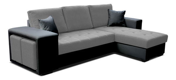 Tato rohová sedací souprava bude krásným moderním doplňkem do vašich obývacích pokojů a interiérů. Sedací část je tvořena pur pěnou a vlnitými pružinami. Je bohatě prošívaná kontrastním šitím. Opěrná část je tvořena třemi širokými polštáři. Sedací souprava je potažena koženkou a látkou. Sedací souprava má dvě šikovné taburetky, které se dají jednoduše odložit do bočnice sedací soupravy. Na výběr je více barevných provedení a kombinovat se dá koženka a látka. Pravé provedení sedací soupravy.