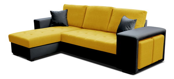Tato rohová sedací souprava bude krásným moderním doplňkem do vašich obývacích pokojů a interiérů. Sedací část je tvořena pur pěnou a vlnitými pružinami. Je bohatě prošívaná kontrastním šitím. Opěrná část je tvořena třemi širokými polštáři. Sedací souprava je potažena koženkou a látkou. Sedací souprava má dvě šikovné taburetky, které se dají jednoduše odložit do bočnice sedací soupravy. Na výběr je více barevných provedení a kombinovat se dá koženka a látka. Levé provedení sedací soupravy.