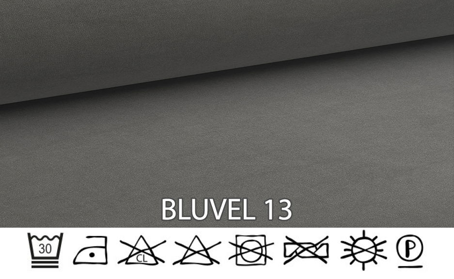 Svými vlastnostmi a vzhledem se řadí mezi sametové látky. Jemná struktura, měkkost a mírný lesk dokonale charakterizují tkaninu Bluvel. Velice odolná a pevná textilie je díky svým vlastnostem často využívána v čalounictví a nábytkářství. Tkanina je odolná vůči oděru a žmolkování. Doporučujeme ošetřovat speciálními přípravky pro čalouněný nábytek za použití jemného hadříku. Nepoužívejte velké množství vody, bělící přípravky a nežehlete. Gramáž: 320g/m2. Složení: 100% polyester.