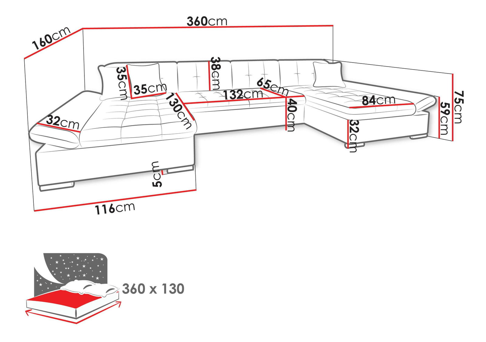 Rohová sedačka s funkcí spánku. Sedačka je rozkládací a poskytuje plochu na spaní 360 x 130 cm. Čalänené opěradlo je pevně uchyceny. Nastavitelné područky Vám umožní snadno nastavit nejpohodlnější oporu.