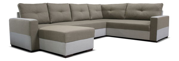 Pěkná moderní rohová sedací souprava ve tvaru do U, která má jednoduchý design a hodí se do jakýchkoliv interiérů. Sedací souprava je potažena kombinací látek. Vnitřek sedací soupravy je vyplněn pur pěnou a vlnitými pružinami. Sedací souprava je pevná a nedá se rozložit. Prostor na sezení a odpočinek lze zvětšit přisunutím širší taburetky. Připojením taburetky vytvoříte plochu na přespání. Na výběr je více barevných provedení. Levé provedení sedací soupravy.