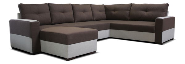 Pěkná moderní rohová sedací souprava ve tvaru do U, která má jednoduchý design a hodí se do jakýchkoliv interiérů. Sedací souprava je potažena kombinací látek. Vnitřek sedací soupravy je vyplněn pur pěnou a vlnitými pružinami. Sedací souprava je pevná a nedá se rozložit. Prostor na sezení a odpočinek lze zvětšit přisunutím širší taburetky. Připojením taburetky vytvoříte plochu na přespání. Na výběr je více barevných provedení. Levé provedení sedací soupravy.