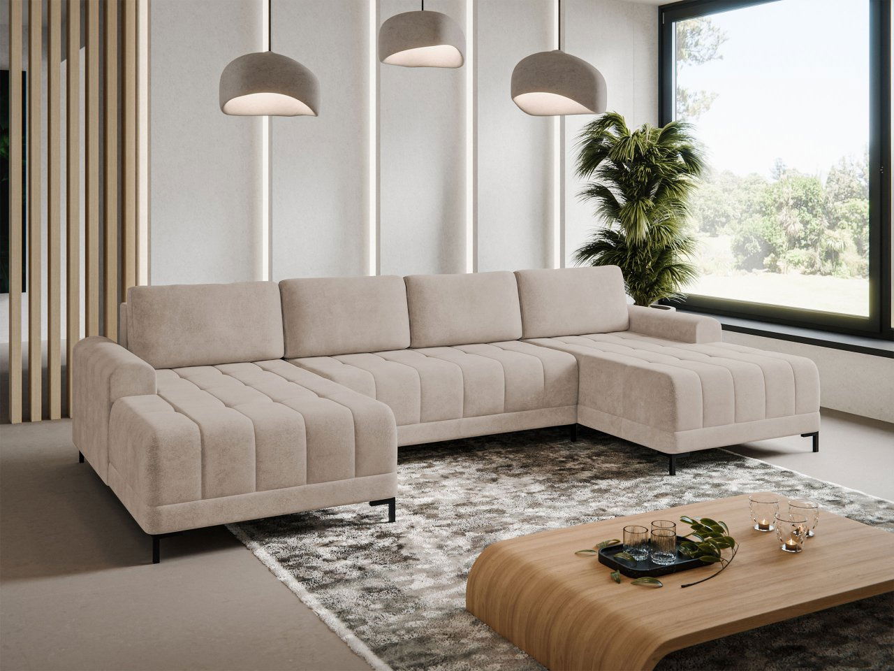 ZobrazitRohová sedací souprava je ideální volbou pro ty, kteří hledají pohodlí a styl. Design rohové sedačky Bonezi XL s funkcí spánku dokonale zapadá do nejnovějších trendů a nadchne svojí jednoduchostí a elegancí. Čalounění v neutrálním odstínu je skvělým základem pro vytváření různých aranžmá. Rohová sedačka do obývacího pokoje má nízké opěradlo v podobě polštářů a područky s minimalistickým vzhledem. Celé to stojí na tenkých, černých nožičkách. Prostorná rohová sedačka navržená ve tvaru písmene U vás obklopí komfortem. Vytváří prostornou a útulnou relaxační zónu. Díky vestavěnému úložnému prostoru na lůžkoviny získáte další úložný prostor. Rozkládací rohová sedačka nabízí prostornost a pohodlí jak pro každý den, tak i při speciálních příležitostech. Rozměry: délka: 337 cm, šířka: 168 cm, výška: 92 cm, plocha na spaní: 298 x 124 cm rozměry úložného prostoru: délka: 130 cm, šířka: 62 cm, výška: 20 cm Rohová strana: symetrická Provedení: konstrukce: borové5 mm hrubá laminovaná deska, sedák a opěradlo: T2837 pěna, tloušťka 10 cm + vlnová pružina "typ A", rozkládací rohová pohovka, automatický rozkládací stroj, má funkci spánku, úložný prostor, nohy: kov + černý plast, opěradlo ve formě pohyblivých polštářů, polštáře pohovka (záda potažená látkou) Záruka: 24 měsíců