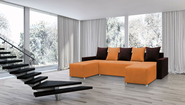 Rohová sedací souprava U Briston s opěrkami (tmavě hnědá oranžová + polštáře)