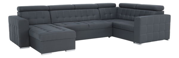 Velká rohová sedačka s dvěma úložnými prostory a rozkladem na příležitostné spaní. Sedačka je čalouněná šedým šenilem Nemo 15 se světlým prošitím. Opěrky hlavy jsou polohovatelné, čímž se umocňuje pohodlí při sezení. Tato sedačka udělá z Vaší obývacího pokoje moderní prostor.