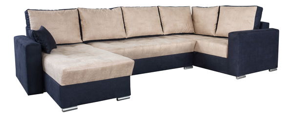 Rohová sedačka U Lambert (béžová + černá) (P) o výšce 89 cm a hloubce 170 cm, model Leonardo 2046 + Leonardo 2015, nabízí pohodlné sezení a moderní design, který osvěží každý interiér. Sedací souprava ve tvaru U má dvoubarevné provedení a přichází se šesti velkými polštáři pro pohodlné opření. Širší opěrky rukou jsou velmi pohodlné a sedačka disponuje dvěma samostatnými úložnými prostory. Tato rohová sedačka je rozkládací, sklopením zadního čela vznikne prostor pro spaní pro dvě vysoké osoby. Celá konstrukce stojí na nízkých kovových zaoblených nožičkách. Konstrukce je vyrobena z masivního dřeva, dřevěných desek a překližky. Výplň je z polyuretanové pěny o hustotě 25 kg/m³ - T2544. Plocha na spaní má rozměry 271 x 125 cm, výška sezení je 40 cm, hloubka sezení s polštáři je 66 cm a bez polštářů 86 cm. Výška sedačky bez polštářů je 71 cm a rozměr mezi levou a pravou částí je 136 cm. Součástí sedačky jsou také 2 boxy na úložení věcí. Tkanina Sawana je jemná a odolná s gramáží 340g/m +/-5%. Test oděru-vzdornosti Martindale dosahuje hodnoty 45 000 cyklů. Ekokůže Mandarin MA, složená ze 100% polyuretanu s gramáží 440g/m³, má test oděruvzdornosti Martindale 30 000 cyklů. Balíky mají rozměry 72x68x166 cm (36 kg), 72x83x171 cm (61 kg), 57x90x136 cm (48 kg) a 17x59x93 cm (8 kg).