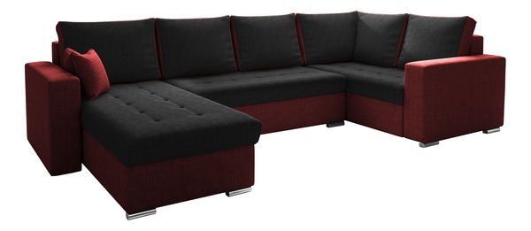 Rohová sedačka U Lambert (černá + červená) (P) o výšce 89 cm a hloubce 170 cm v provedení Sawana 14 + Sawana 13 je pohodlná sedací souprava vhodná do větších obývacích pokojů. Její dvoubarevné provedení dodává interiéru moderní vzhled a svěžest. K sedačce jsou součástí šest velkých polštářů pro pohodlné opření se. Širší opěrky rukou po bocích sedačky také přispívají k pohodlnému pobytu. Konstrukce sedačky je z masivního dřeva, dřevotřísky v tloušťce 16 mm, dřevovláknité desky a překližky. Výplní je polyuretanová pěna 25 kg/m³ - T2544. Sedačka má rozměr 271 x 125 cm a výšku sezení 40 cm. Hloubka sezení s polštáři je 66 cm a bez polštářů 86 cm. Výška sedačky bez polštářů je 71 cm a rozměr mezi levou a pravou částí sedačky je 136 cm. Nožičky jsou chromové a sedačka disponuje také dvěma samostatnými úložnými prostory. Sedačka je také rozkládací, sklopením zadního cela vznikne prostor pro spaní pro dvě vysoké osoby. Tkanina Sawana s gramáží 340 g/m +/-5 % je odolná tkanina s jemnou strukturou, která se skvěle hodí pro čalounění pohovek a postelí. Tkanina Mandarin MA je kvalitní imitace pravé kůže, měkká, flexibilní, barvostálá a odolná. Sedačka se dodává ve 4 balících o hmotnosti od 8 do 61 kg.