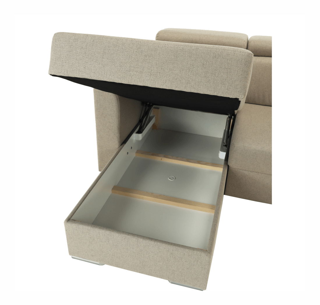 Poskytuje funkci rozložení. Má úložný prostor a polohovací opírky hlavy. Dodávané s polštáři. Dodávané v demontu.