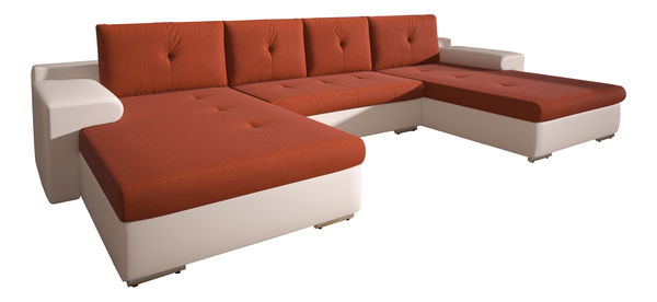 Moderní rohová sedačka ve tvaru U s názvem Marlon v oranžové a bílé barvě o výšce 78 cm a hloubce 181 cm je vyrobena z masivního dřeva, dřevotřísky, dřevovláknité desky a překližky. Sedačka má polyuretanovou pěnovou výplň o hustotě 25 kg/m³ - T2544 a pružiny Faliste, čtyři velké polštáře pro pohodlné sezení a široké opěrky rukou, které mohou sloužit jako odkládací prostor. Výška sezení je 40 cm, plocha spaní je 300 x 120 cm, výška sedačky po opěrky je 54 cm, výška sedačky bez polštářů je 62 cm. Sedačka má jednu úložnou skříňku a lze ji rozložit na lůžko na spaní. Konstrukce stojí na nízkých kovových nožičkách a má možnost rozkladu. Sedačka má tkaninu Sawana, která je lehká a odolná, a ekokůži Mandarin MA, která je kvalitní imitací pravé kůže. Tkanina Sawana má test oděruvzdornosti Martindale: 45 000 cyklů a ekokůže Mandarin MA má test oděruvzdornosti Martindale: 30 000 cyklů. Sedačka se balí do tří balíků o rozměrnostech 63x115x183 cm - 55 kg, 63x115x183 cm - 55 kg a 58x90x130 cm - 48 kg.