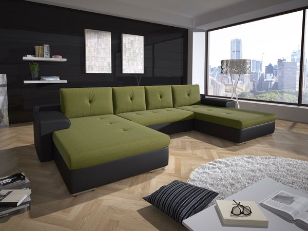 Rohová sedačka U Marlon (zelená + černá) (L) ve tvaru U je moderní sedací souprava, která splní požadavky i těch nejnáročnějších zákazníků. Tento kousek jistě upoutá vaši pozornost díky své dvoubarevné kombinaci tkaniny a ekokůže. Sedačka má čtyři velké polštáře pro pohodlné sezení a široké opěrky rukou, které mohou posloužit také jako odkládací prostor. Konstrukce stojí na nízkých kovových nožičkách a disponuje jedním úložným prostorem. Mohutná rohová sedací souprava je vyrobena z masivního dřeva, dřevěné desky a překližky. Výplň sedačky tvoří polyuretanová pěna a pružiny Faliste. Sedačka je také rozkládací, takže může sloužit také jako lůžko na spaní. Plocha spaní je 300 x 120 cm a výška sezení je 40 cm. Celkové rozměry jsou 78 cm výška, 181 cm hloubka a 130 cm šířka mezi otomany. Sedačka obsahuje 4 polštáře a je potažena tkaninou Sawana a ekokůží Mandarin MA, které jsou odolné vůči oděru a zároveň velmi příjemné na dotek. Balení obsahuje 3 balíky o celkové hmotnosti 158 kg.