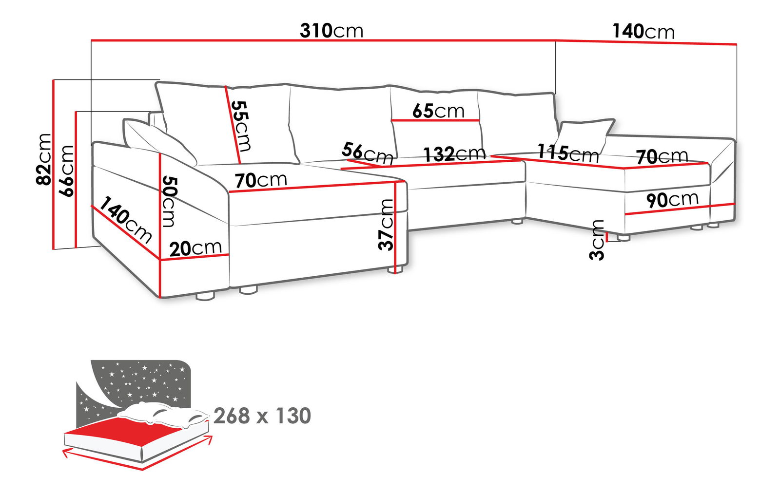 268 x 130 cm