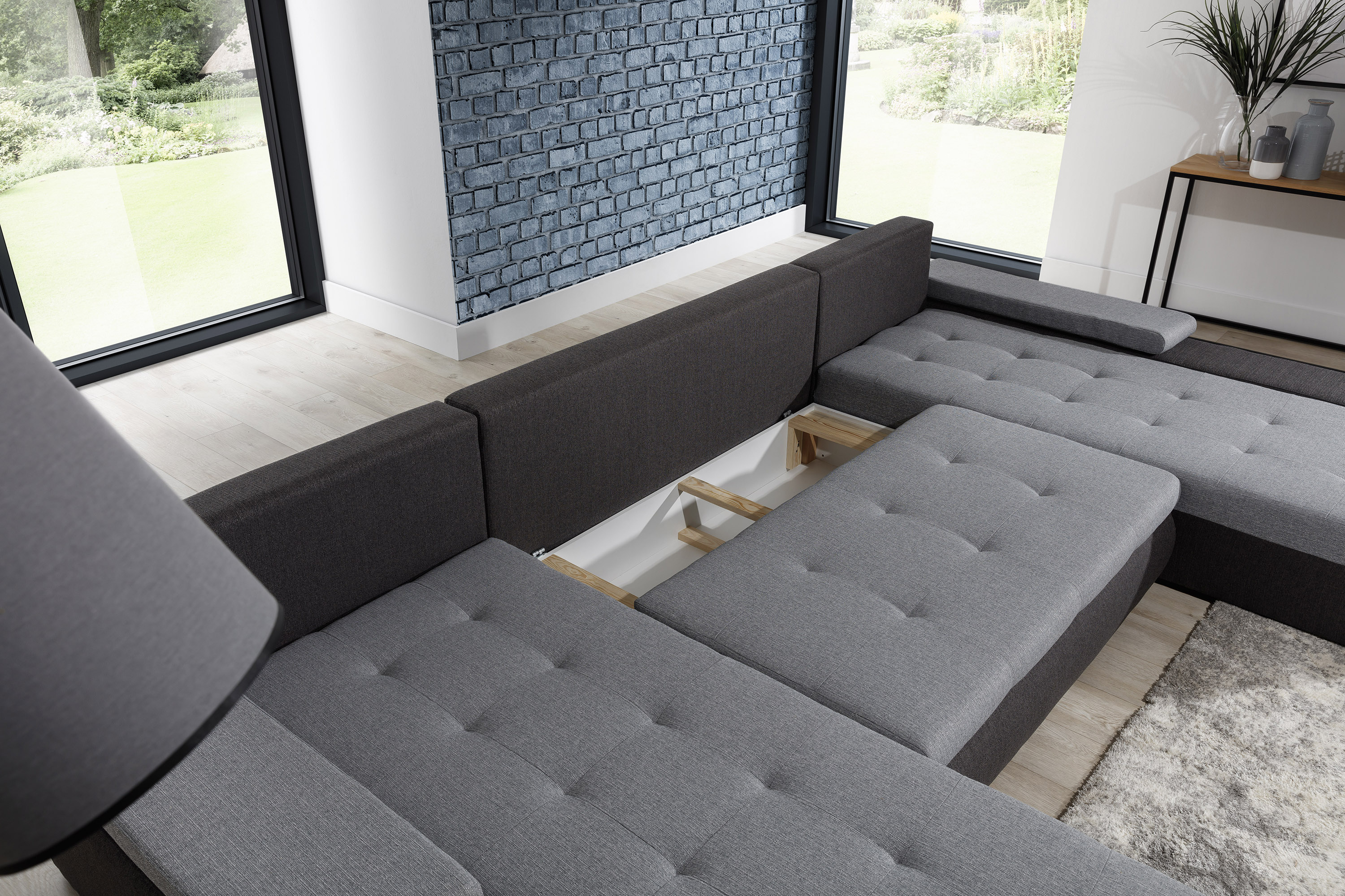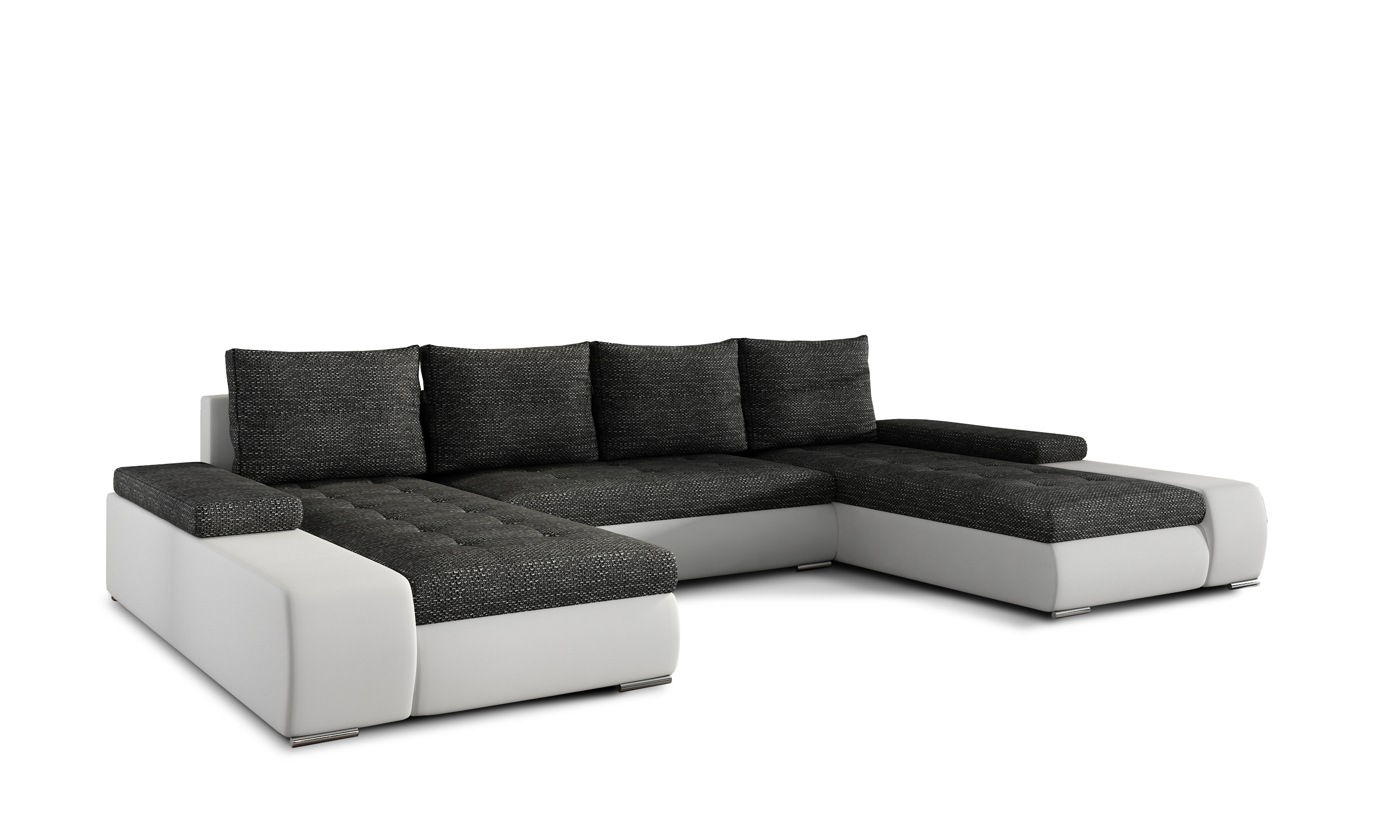 Rohová rozkládací pohovka Marino. Máte rádi prostorný nábytek, který vám umožní svobodný relax? Jste ve stádiu uspořádání obývacího pokoje, která je dost prostorná? Rohová sedačka Marino vás jistě potěší! Model Marino má rozměry 363x200x80, je přímo ideální pro velké obývací pokoje a pro domácí designéry, kteří si chtějí interiér uspořádat stylově a útulně. Rozložení ve tvaru U mu dodává eleganci a jasnost. Moderní design, mírně zaoblené povrchové úpravy, jemné prošívání a ozdobné, prostorné polštáře výrazně ovlivňují celkový, stylový vzhled nábytku. Čalounění je vyrobeno z nejkvalitnějšího materiálu odolného proti oděru a vyblednutí - to dělá z modelu Marino kus nábytku, který potěší oko uživatele a zajišťuje pohodlí. Tento model obsahuje kombinaci dvou barevných provedení, které je možné zvolit a změnit podle vašich preferencí. Díky vhodně tvarovaným opěradlům, širokým područkám a sedadlům vyplněných vlnovou pružinou a pěnou T30 poskytuje rohová pohovka maximální pohodlí při odpočinku během dne. Pohovku lze přizpůsobit funkci spánku pomocí výsuvného sedadla a reverzibilní zadní části rohu. Zároveň poskytuje i úložný prostor na lůžkoviny. Pokud hledáte nábytek, který zaujme svou funkčností, stylem a solidním zpracováním, rohová sedačka Marino bude tou nejlepší volbou.