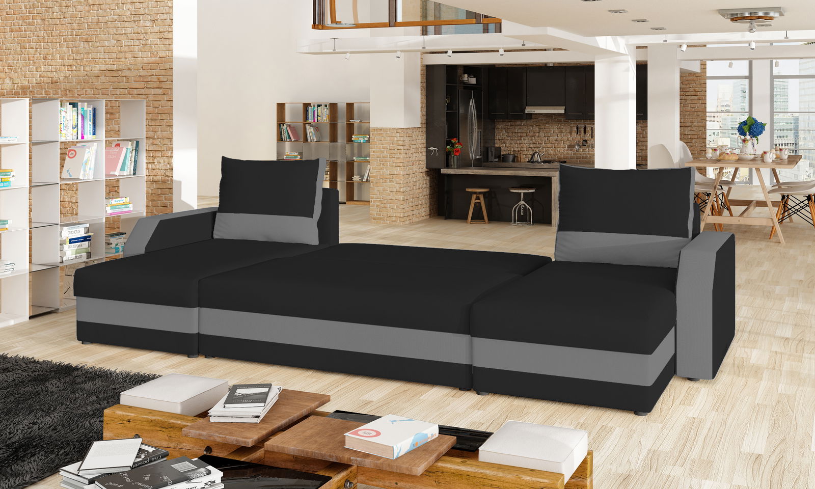 ZobrazitRohová sedačka Marion. Hledáte stylový a prostorný nábytek do obývacího pokoje velkého rozměru? Rohová pohovka Marion je model, který hledáte. Díky originálnímu designu a multifunkčnosti nábytku je rohová sedačka Marion stále více oceňována mezi příznivci moderního interiéru. Rohová sedačka Marion je kombinací klasiky a inovace. Jednoduchá struktura sedačky kombinovaná s geometrickými koncovkami područek, barevnou kombinací čalounění a prostornými polštáři jsou doplňky, které se perfektně hodí do moderního, retro ale i industriálního stylu. Dostupná v široké škále barev, čili si můžete snadno přizpůsobit celkový design interiéru a vnést do obývacího pokoje prvek modernosti. Uspořádání ve tvaru písmene U umožňuje uspořádat nábytek tak, aby nezabíral extra prostor obývacího pokoje. Model Marion zaručuje relaxaci na nejvyšší úrovni, hlavně díky vhodnému profilování opěradel a vyplnění sedadel elastickou pěnou T25. Rozměry 307x146x85 cm umožňují svobodný odpočinek všem členům domácnosti. Po vytažení spodní části rohu a otočení opěradla má uživatel k dispozici další prostor na spaní a úložný prostor na lůžkoviny.