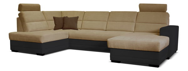 Tato rohová sedací souprava ve tvaru do U bude ve vašem obývacím pokoji působit majestátně a elegantně zároveň. Sedací část je tvořena pur pěnou a vlnitými pružinami. Opěrná část je vodorovně prošívaná. Pro zvýšení vašeho komfortu má sedačka i opěrky hlavy. Sedačku lze rozložit a disponuje až dvěma úložnými prostory. Poskytne vám tedy dostatek prostoru pro ložní prádlo a jiné doplňky. Pravé provedení sedací soupravy.