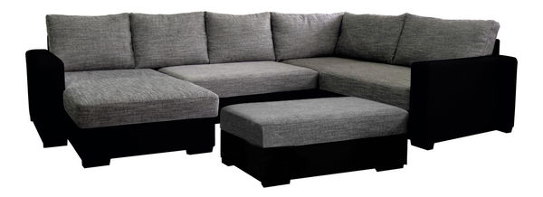 Moderní rohová sedačka do tvaru písmene U, se dokonale hodí do obývacího pokoje s nadčasovým nábytkem. Je celočalouněná dvěma materiály: koženkou a šenilem. Je nerozkládací, no spací prostor vznikne přisunutím taburetky. Šedá sedací část je doplněna o černou a černé plastové nožičky. Šířka opěráku (bočnice) je 17,5 cm. Sedačka neobsahuje úložný prostor.