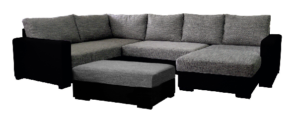 Moderní rohová sedačka do tvaru písmene U, se dokonale hodí do obývacího pokoje s nadčasovým nábytkem. Je celočalouněná dvěma materiály: koženkou a šenilem. Je nerozkládací, no spací prostor vznikne přisunutím taburetky. Šedá sedací část je doplněna o černou a černé plastové nožičky. Šířka opěráku (bočnice) je 17,5 cm.