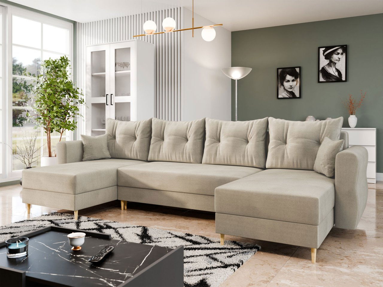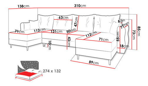ZobrazitRohová sedací souprava je ideální volbou pro ty, kteří hledají pohodlí a styl. Novou definici pohodlí přináší rohová sedačka Saniolan U s funkcí spánku! Zajímavá silueta jde ruku v ruce s praktičností. Sedačka ve tvaru U poskytuje velkou relaxační plochu a umožňuje vám volně pořádat setkání s přáteli nebo rodinou. Štíhlé vysoké nohy zvětšují strukturu rohové sedačky obývacího pokoje a dodávají jí optickou lehkost. Minimalistický tvar se hodí k různým interiérovým aranžmá. Rohová sedačka U má vestavěný úložný prostor. Toto příslušenství je mimořádně užitečné v jakémkoli prostoru. Rozměry: délka: 310 cm, šířka: 138 cm, výška: 85 cm, plocha na spaní: 274 x 132 cm, rozměry úložného prostoru: délka: 131 cm, šířka: 59 cm, výška: 24 cm Rohová strana: symetrická Provedení: rám: dřevo + 16 mm T30 + vlnová pružina "typ A", opěradlo: pěna T30, tloušťka 8 cm, rohová sedačka je rozkládací, má funkci spánku, úložný prostor, nohy: dřevo, opěradlo ve formě pohyblivých polštářů vyplněných mletou pěnou, polštáře v ceně - zapínané na zip, volná látkou) Záruka: 24 měsíců