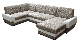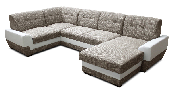 Moderní a prostorná rohová sedací souprava ve tvaru do U, která má zaoblené područky a prošívané polštáře v opěradlové části. Sedací souprava je potažena koženkou a látkou. V případě potřeby je možné soupravu i rozložit a vytvořit tak plochu na přespání. Užitečný je i úložný prostor nacházející se v otomanu sedačky. Pravé provedení sedací soupravy.