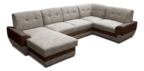 Moderní a prostorná rohová sedací souprava ve tvaru do U, která má zaoblené područky a prošívané polštáře v opěradlové části. Sedací souprava je potažena koženkou a látkou. V případě potřeby je možné soupravu i rozložit a vytvořit tak plochu na přespání. Užitečný je i úložný prostor nacházející se v otomanu sedačky. Levé provedení sedací soupravy.