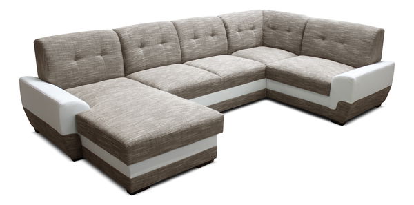 Moderní a prostorná rohová sedací souprava ve tvaru do U, která má zaoblené područky a prošívané polštáře v opěradlové části. Sedací souprava je potažena koženkou a látkou. V případě potřeby je možné soupravu i rozložit a vytvořit tak plochu na přespání. Užitečný je i úložný prostor nacházející se v otomanu sedačky. Levé provedení sedací soupravy.
