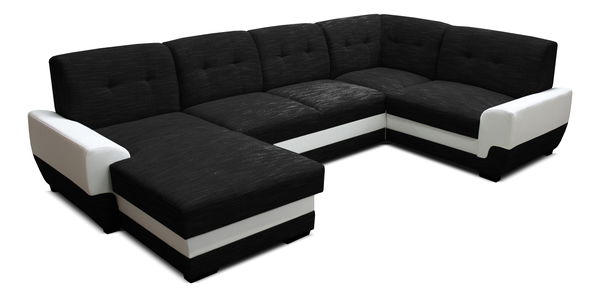 Moderní a prostorná rohová sedací souprava ve tvaru do U, která má zaoblené područky a prošívané polštáře v opěradlové části. Sedací souprava je potažena koženkou a látkou. V případě potřeby je možné soupravu i rozložit a vytvořit tak plochu na přespání. Užitečný je i úložný prostor nacházející se v otomanu sedačky. Levé provedení sedací soupravy.