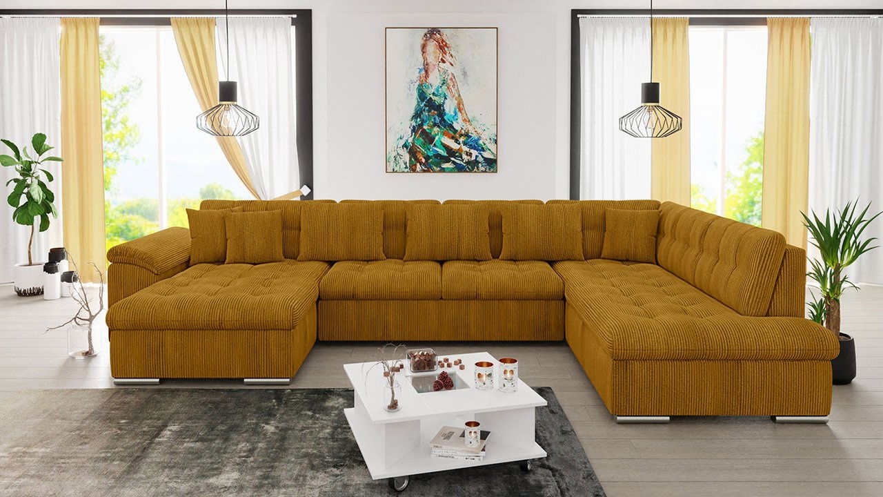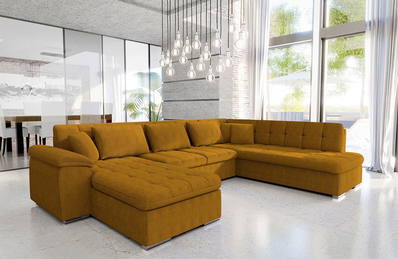 Velká rohová pohovka do obývacího pokoje je ideální volbou pro ty, kteří hledají pohodlí a styl. Ve svém bytě máte značný prostor, takže velká rohová sedačka do obývacího pokoje Tony je pro vás to pravé. Nabízí velký prostor pro spaní i pohodlný odpočinek během dne. Je vyroben z výjimečné látky, která obohatí váš prostor a učiní jej skutečně jedinečným. Rohová sedací souprava se vyznačuje solidním zpracováním. Kombinace krásného designu a funkčnosti. Je to rozkládací model opatřený polštáři na zip. Volně stojící varianta nabízí široké možnosti uspořádání. Jeho tvar připomíná písmeno "U". Díky bohaté barevné škále se hodí téměř ke každému stylu. Rozměry: délka: 348 cm, šířka: 205 cm, výška: 76 cm, povrch na spaní: 290 x 125 cm Rohová strana: levá nebo pravá Provedení: dřevěný rám + dřevotříska, vysoce elastická pěna vlnitá pružina, rozkládací rohová pohovka, funkce spánku, bez nádoby zip, volně stojící rohová pohovka (zadní část čalouněná látkou) Záruka: 24 měsíců