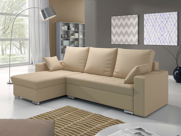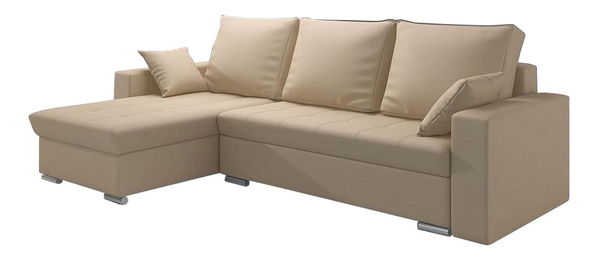 Rohová sedačka Valmero v béžové barvě je ideální volbou pro minimalističtější interiéry domácnosti. Konstrukce z masivního dřeva, dřevotřísky a překližky zajišťuje pevnost a stabilitu. Sedačka má tři velké polštáře na opření zad a dva malé dekorační polštářky, které jsou zajímavě prošívané. Výplň sedačky tvoří polyuretanová pěna o hustotě 28 kg/m³. Sedačka má možnost rozkladu a dvěma úložnými boxy, což ji činí praktickou a úspornou na místě. Sedačka má výšku 89 cm a hloubku 165 cm, s výškou sezení 41 cm. Bez polštářů má hloubku sezení 86 cm as polštáři 66 cm. Nožičky jsou chromové a sedačka stojí na nich. Tkanina je ekokůže Mandarin MA, která je měkká, flexibilní, odolná a barvostálá. Gramáž tkaniny je 440 g/m³, přičemž test oděruvzdornosti Martindale dosahuje 30 000 cyklů. Sedačka Valmero je dodávána ve třech balících, které mají rozměry 72x71x166 cm o hmotnosti 39 kg, 58x91x139 cm o hmotnosti 41 kg a 60x33x92 cm o hmotnosti 24 kg.