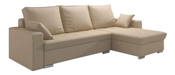 Rohová sedačka Valmero (béžová) (P) vám přináší útulný nábytek do vaší domácnosti. Tento kus v minimalistickém stylu vás potěší svojí elegancí a jednoduchostí. Sedačka má tři velké polštáře na opření zad a dva malé dekorační polštářky, které vám poskytnou dostatečnou podporu a pohodlí. Sedák je zajímavě prošívaný, což dodává sedačce vkusný vzhled. Výhodou je také možnost rozložení a dvěma úložnými boxy, kde si můžete uložit věci ke skladování. Sedačka Valmero je vyrobena z masivního dřeva, dřevotřísky, dřevovláknité desky a překližky, což zaručuje její pevnost a stabilitu. Výplň tvoří polyuretanová pěna o hustotě 28 kg/m³ - T2844. Sedačka má rozměr 89 cm x 165 cm a nabízí plochu na spaní o rozměrech 200 x 135 cm. Výška sezení je 41 cm, hloubka sezení s polštáři je 66 cm a bez polštářů 86 cm. Sedačka má chromové nožičky a je vybavena 3 velkými a 2 malými polštáři. Tkanina ekokůže Mandarin MA je kvalitní imitace pravé kůže, měkká, flexibilní, odolná a barvostálá. Můžete ji jemně mýt navlhčeným hadříkem. Balení obsahuje 3 balíky o celkovém objemu 0,76 m³.