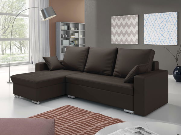 Rohová sedačka Valmero (hnědá) (L) o výšce 89 cm a hloubce 165 cm je ideální volbou pro každou domácnost. Tento kousek v basic stylu s jednobarevným provedením z ekokůže zapadne dokonale do minimalistického interiéru. Sedačka nabízí tři velké polštáře na opření zad a dva malé dekorační polštářky. Sedák je zajímavě prošívaný. Kromě toho lze sedačku rozložit a využít tak její praktické úložné boxy. Sedačka Valmero stojí na oblých kovových nožičkách a její konstrukce sestává z masivního dřeva, dřevotřísky o tloušťce 16 mm, dřevovláknité desky 3 mm a překližky. Výplň tvoří polyuretanová pěna T2844 o hustotě 28 kg/m³. Rozměry plochy na spaní jsou 200 x 135 cm, výška sezení je 41 cm, hloubka sezení s polštáři je 66 cm a bez polštářů 86 cm. Sedačka je dodávána ve třech balících o celkové váze 104 kg. Ekokůže Mandarin MA, ze které je sedačka vyrobena, je kvalitní imitací pravé kůže, která je měkká, flexibilní, odolná a barvostálá. Textilii lze mýt jemně navlhčeným hadříkem. Test oděruvzdornosti Martindale překročil hodnotu 30 000 cyklů.
