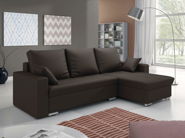 Rohová sedačka Valmero (hnědá) (P) o výšce 89 cm a hloubce 165 cm je ideálním doplňkem pro každou domácnost. Tato sedačka v basic stylu v jednobarevném provedení z ekokůže se dokonale hodí do minimalistických interiérů. Sedáčka disponuje třemi velkými polštáři na záda a dvěma malými dekoračními polštářky. Okrasné prošívání sedáku dodává eleganci celému kusu nábytku. Kromě toho se sedačka může rozložit a nabízí dva úložné boxy. Na kovových nožičkách stojí stabilně. Konstrukce sedačky je z masivního dřeva, dřevotřísky a překližky, s výplní z polyuretanové pěny 28 kg/m³ - T2844. Plocha spaní má rozměry 200 x 135 cm a výšku sezení 41 cm. Sedačka je vybavena chromovými nožičkami a má celkem 3 velké a 2 malé polštáře. Ekokůže Mandarin MA, ze které je sedačka ušita, je kvalitní imitace pravé kůže a její složení je 100% polyuretan. Test odolnosti Martindale dosahuje 30 000 cyklů. Sedačka Valmero přichází ve třech balících a celková hmotnost je 104 kg.