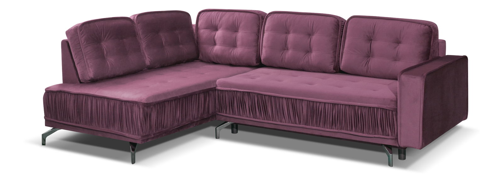 Rohová sedačka Variana (růžová) (L) o výšce 89 cm a hloubce 180 cm je dokonalým místem k odpočinku po náročném dni. Tato elegantní sedačka s prošívanými opěradlovými polštáři a sedací částí působí velmi stylově. Sedačka má kovové nohy, které zajišťují její stabilitu. Pokud potřebujete, můžete ji jednoduše rozložit a vytvořit tak pohodlnou spací plochu. Sedačka má také úložný prostor na ložní prádlo a jiné doplňky. Konstrukce je vyrobena z nábytkové desky a masivního dřeva, sedací část má falisté pružiny a použita je vysokoelastická pěna T30. Typ rozkladu je typ DL, výška sedu je 44 cm, hloubka sedu je 56 cm a výška opěradla je také 44 cm. Sedačka má plochu spaní 216x120 cm. K montáži kovových nohou je zapotřebí nářadí. Sedačka má ozdobné šití, dekorativní prvky a je čalouněná.