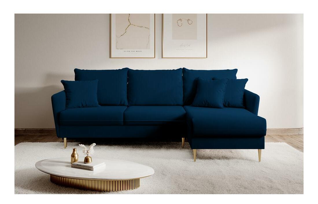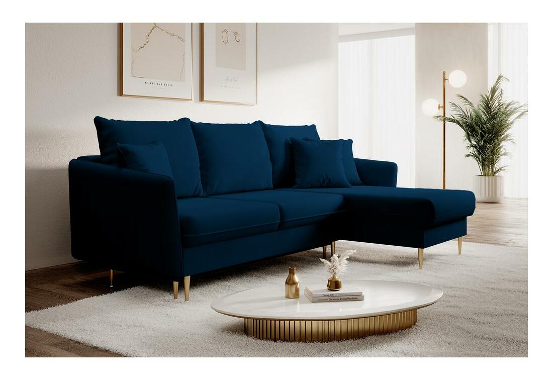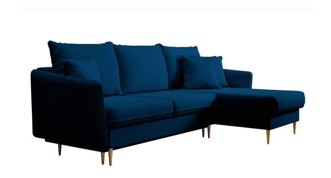 Hledáte recept na úspěšné uspořádání menšího prostoru? Tak to jste na správném místě! Krásná rohová pohovka vám pomůže vytvořit opravdu jedinečnou kompozici! Rohová sedačka je návrhem, který vzbuzuje obdiv svojí minimalistickou formou, ve které je jasně viditelná inspirace klasickými aranžérskými řešeními. Vysoké, téměř obdélníkové polštářky zádové opěrky dostatečně podepřou vaše záda a pohodlné opěradlo vám umožní zasloužený odpočinek. Povrch nábytku je vyplněn pěnou a vlnitými pružinami, takže je dostatečně měkký, aby bylo jeho používání mimořádně příjemné, a zároveň dostatečně pružný, aby nedocházelo k deformacím. Díky vestavěné funkci spánku založené na praktickém rozkládacím systému DL můžete nábytek jednoduše přeměnit na prostornou postel, kde můžete přespat hosty nebo zorganizovat schůzku pro větší skupinu. Detaily produktu: rám je vyroben z kombinace dřeva a dřevotřísky, díky čemuž je konstrukce odolná vůči deformaci, sedák vyplněný vlnovými pružinami a pěnou T3037 je pružný a po použití se rychle vrátí do původního tvaru, nábytek je univerzální, můžete volně měnit stranu, ve standardním kontejnery na ložní prádlo lze vyjmout polštáře, volně stojící model - má čalouněná záda, sada obsahuje dekorační polštáře, výška zádové opěrky: 88 cm, šířka opěradla: 223 cm, výška loketní opěrky: 64/75 cm, nábytek čalouněný námořnická modrá Magic Velvet je stylový samet s jemným leskem. Odolný vůči tření, žmolkování a světlu. Waterproof Technology způsobuje, že kapalina kondenzuje na povrchu materiálu ve formě kapek. Za zvýšenou odolnost vůči aktivitě zvířat je zodpovědná technologie šetrná ke zvířatům. Tkanina zpomalující hoření.