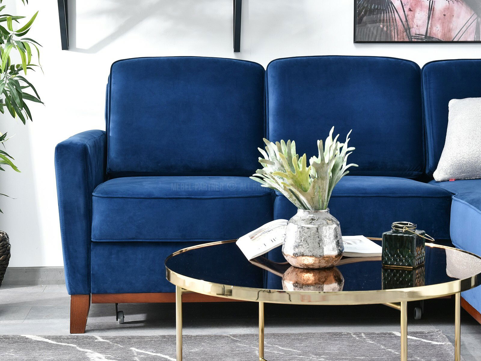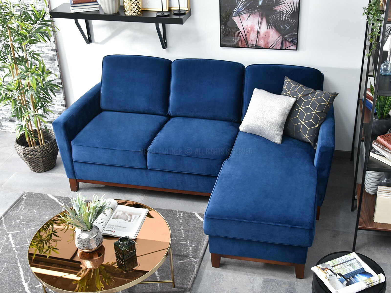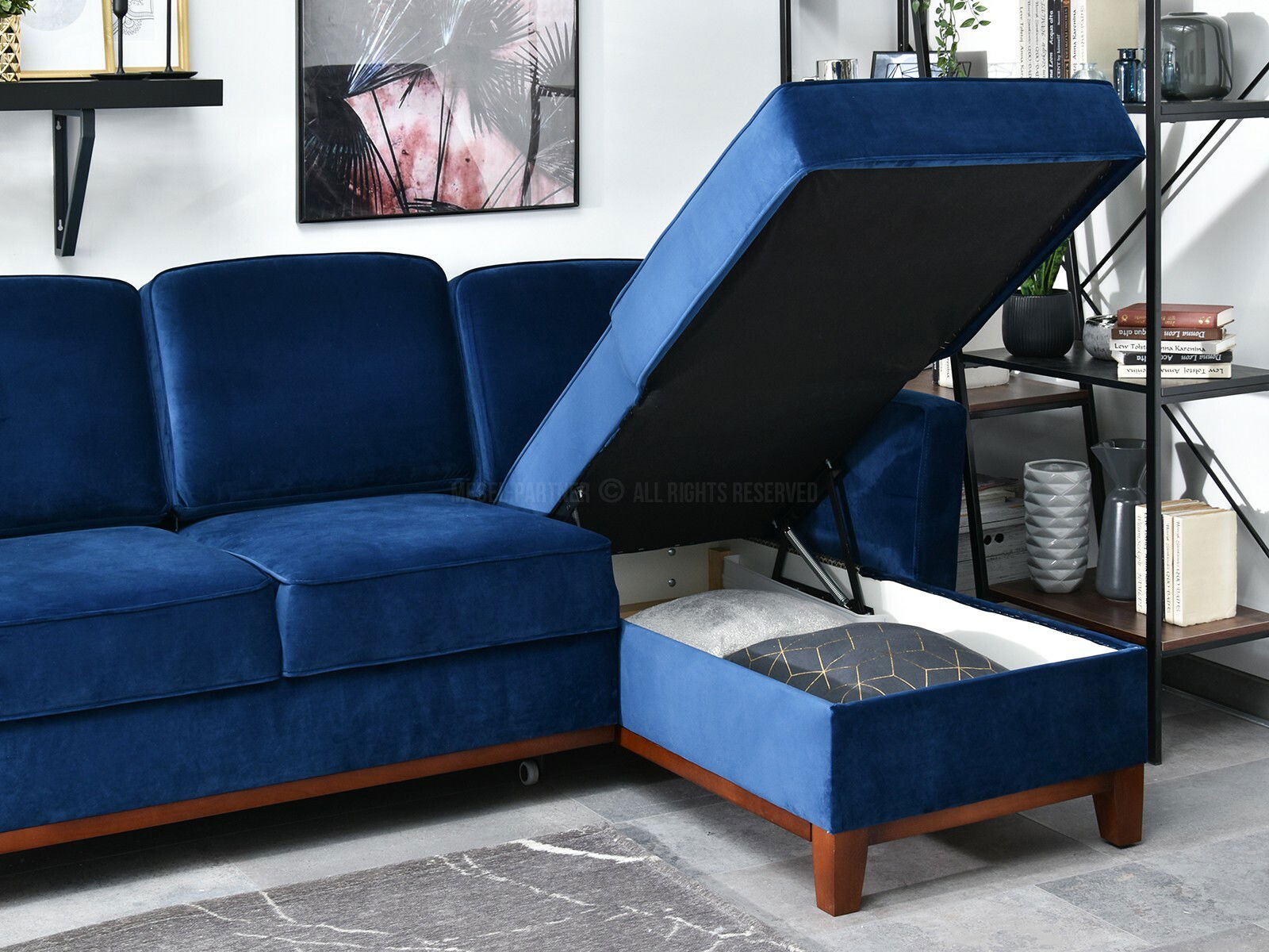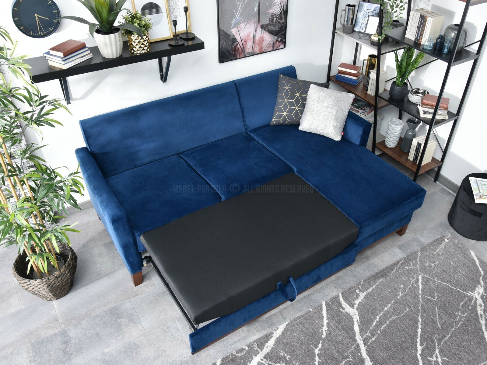 Rohová sedačka Biblioteca (tmavě modrá + ořech)