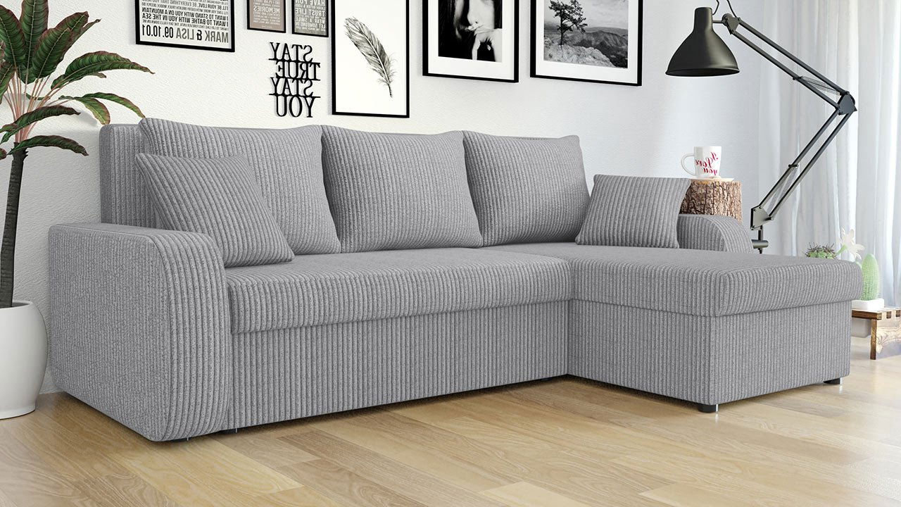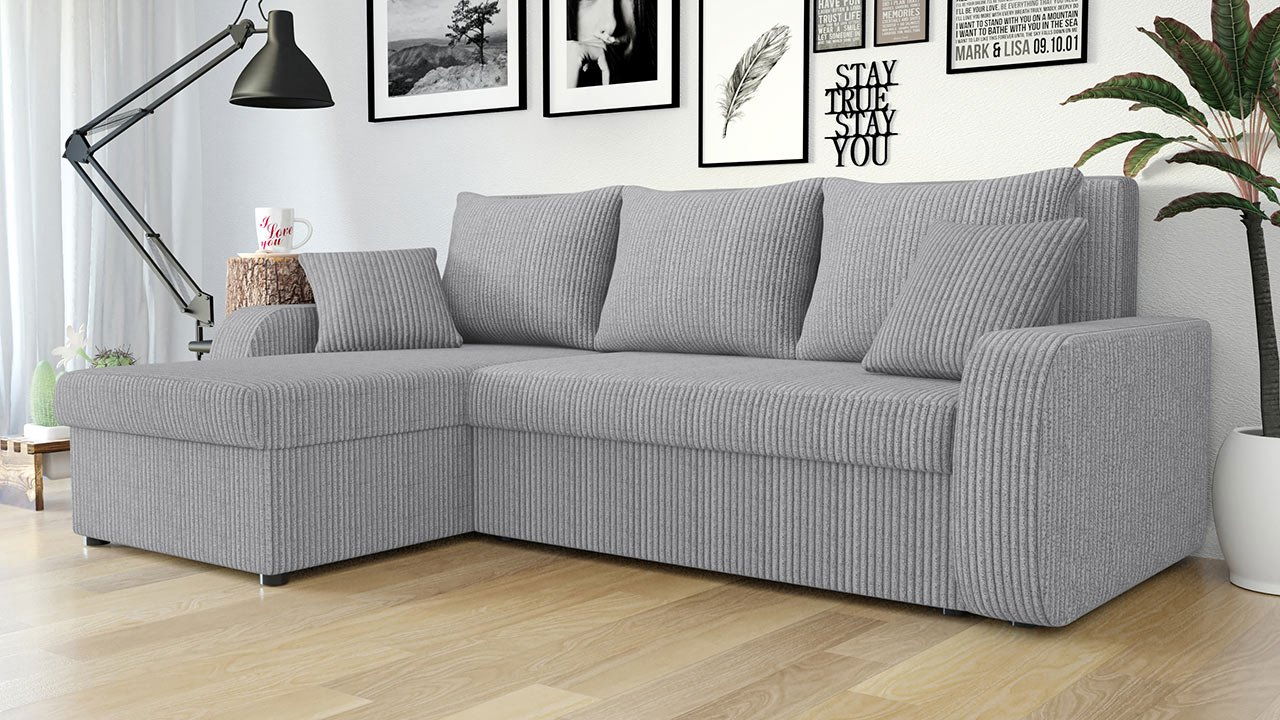 Jednoduchý a klasický design rohové rozkládací sedačky Delmur je přerušen manšestrovou látkou se zajímavou texturou. Čalouněný nábytek pokrytý tímto typem materiálu se vrátil ve velkém stylu a stal se stálicí moderních zařízení obývacího pokoje či ložnice. Rohová sedačka s funkcí spánku nabízí dva prostorné úložné boxy, do kterých se vejdou všechny vaše věci. Obsahuje také dva dekorační polštáře potažené také manšestrovou látkou. Rohová rozkládací sedačka Delmur je přes den skvělou dekorací do obývacího pokoje a v noci poslouží jako velká postel pro pohodlný odpočinek.