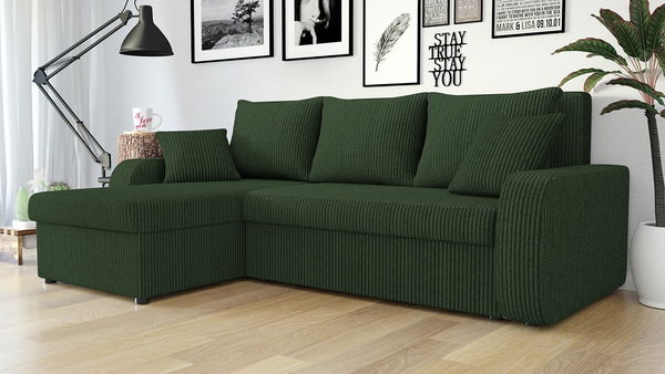 Jednoduchý a klasický design rohové rozkládací sedačky Delmur je přerušen manšestrovou látkou se zajímavou texturou. Čalouněný nábytek pokrytý tímto typem materiálu se vrátil ve velkém stylu a stal se stálicí moderních zařízení obývacího pokoje či ložnice. Rohová sedačka s funkcí spánku nabízí dva prostorné úložné boxy, do kterých se vejdou všechny vaše věci. Obsahuje také dva dekorační polštáře potažené také manšestrovou látkou. Rohová rozkládací sedačka Delmur je přes den skvělou dekorací do obývacího pokoje a v noci poslouží jako velká postel pro pohodlný odpočinek.