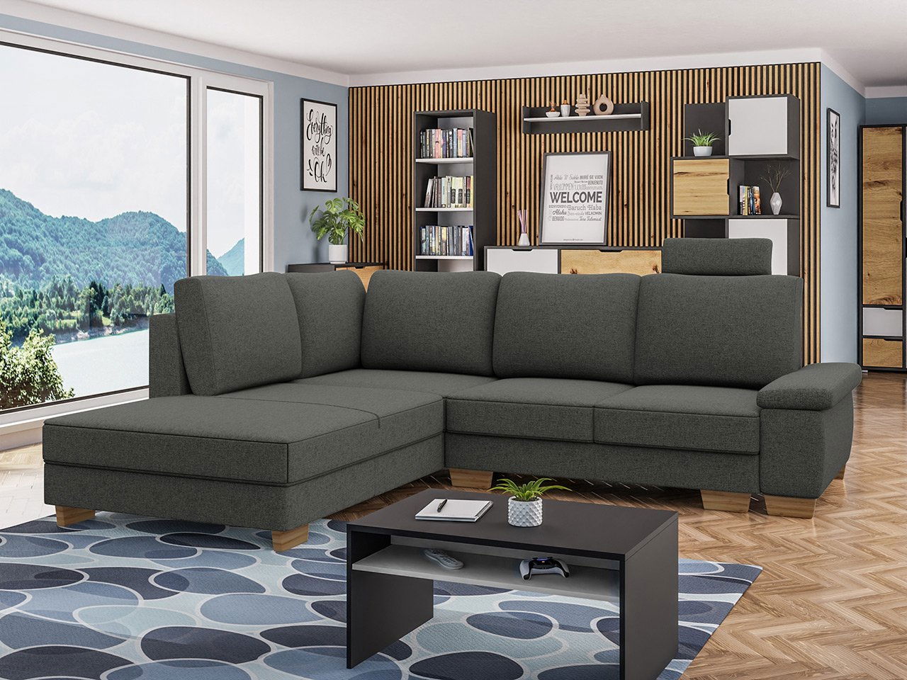 Rohová sedačka Loxy 2 (tmavě šedá) (s úl. prostorem) (L)