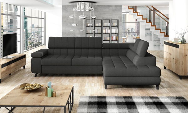 Styl, který odlišuje moderní rohovou sedačku Evrona, dokonale zapadá do interiéru elegantního obývacího pokoje. Matné nohy dělají ze sedačky stejně působivý vzhled jak v podkroví, tak v průmyslovém obývacím pokoji. Široká škála potahových textilií obsahuje také praktické návrhy materiálů odolných vůči skvrnám, jakož i materiálů se zvýšenou odolností proti poškrábání. Zvýšené pohodlí během odpoledního odpočinku na sedačce poskytuje měkké nábytkové sedadlo podepřené pevnou konstrukcí i nastavitelné opěrky hlavy. Jejich nastavení lze zcela přizpůsobit tvaru, čímž se zvyšuje vaše pohodlí. Z hlediska funkčnosti se rohová pohovka snadno rozloží a připraví místo na spaní pro sebe nebo hosty pouhým vysunutím delší části sedadla. A co víc, uvnitř nábytku je úložný prostor na ložní prádlo. Toto důmyslně skryté úložiště bude užitečné pro polštáře a přikrývky, jakož i místo pro ukládání sezónního oblečení a jiného zřídka používaného příslušenství. Rohová sedačka ve tvaru „L“ je volně stojící model, což znamená, že její záda jsou čalouněna látkou. Toto řešení umožňuje jakékoli uspořádání nábytku v prostoru - umístěné dokonce i ve středu obývacího pokoje, bude to vypadat skvěle.