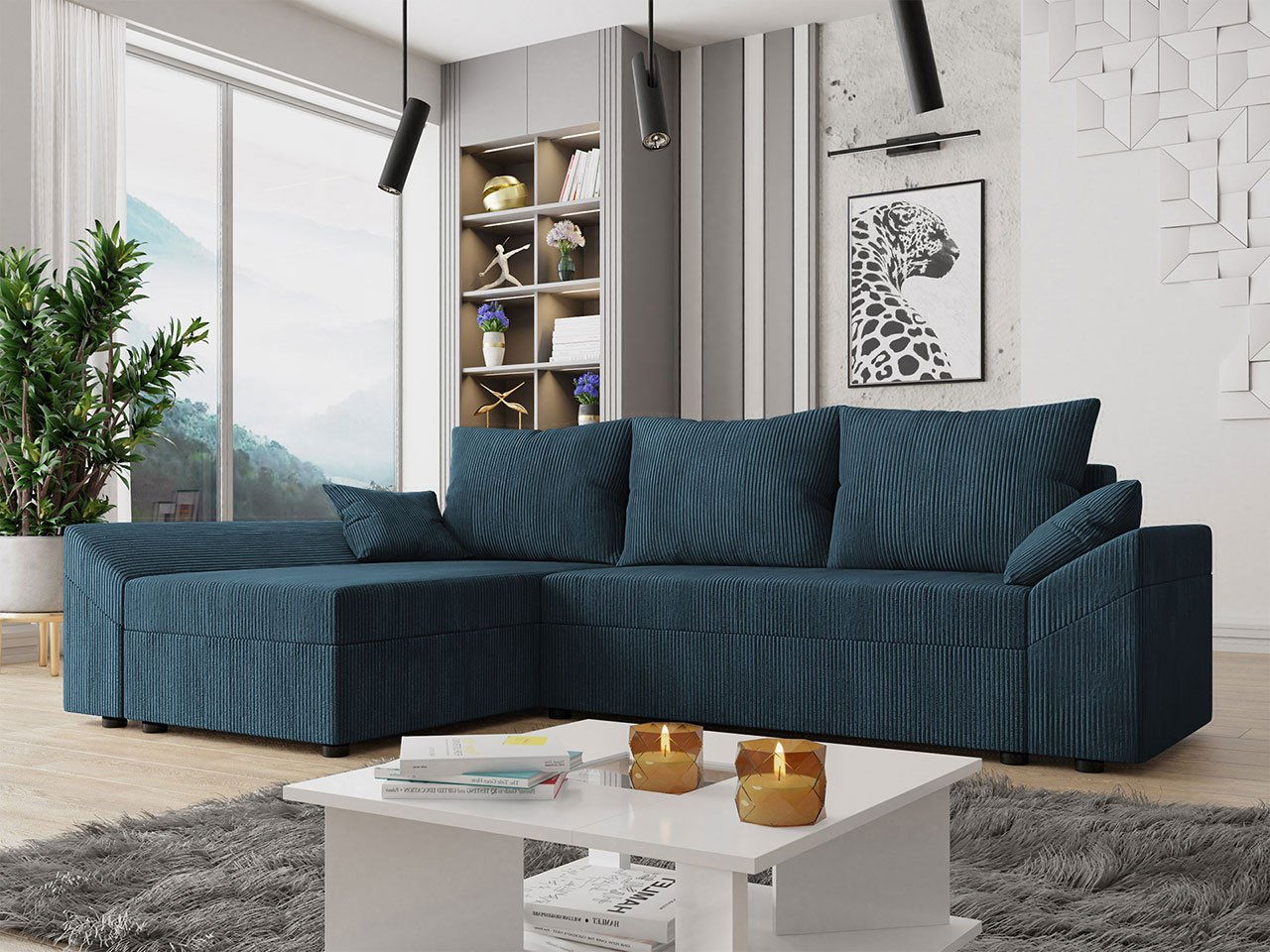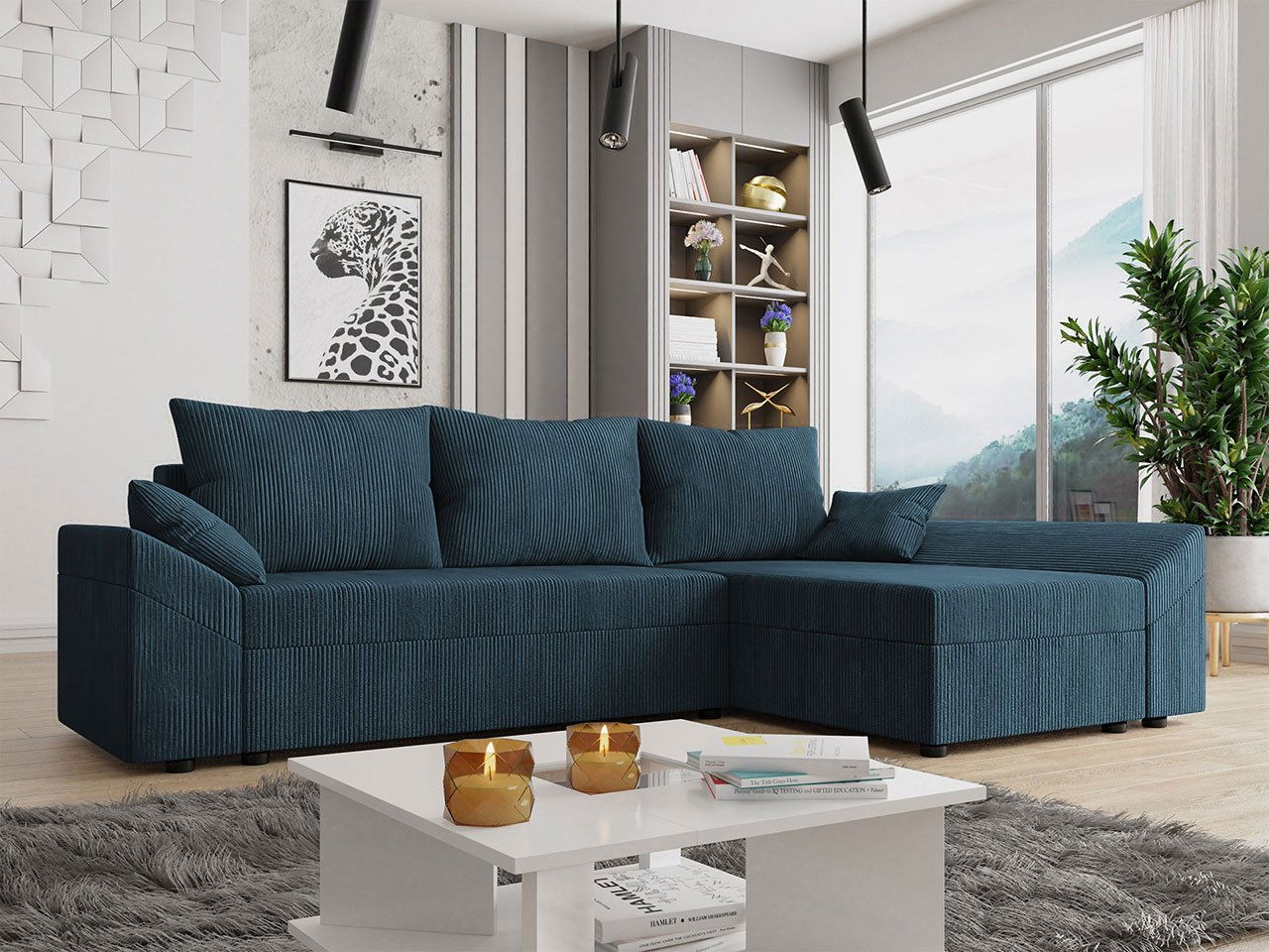 ZobrazitHledáte rohovou sedačku, která dodá vašemu interiéru jedinečný designový akcent? Podívejte se na rohovou sedačku Poltosa. Je potažena módní tkaninou s žebrovanou strukturou, která je měkká a příjemná na dotek. Nábytek čalouněný manšestrem se v posledních měsících stal hitem interiérového designu! Rohová sedačka Poltosa s funkcí spaní má velký úložný prostor pro lůžkoviny, díky kterému je můžete v obývacím pokoji snadno uskladnit a uklidit tak prostor. Po rozložení sedačky získáte plochu 200×130 cm, která je ideální pro každodenní odpočinek pro dvě osoby. Opěradlo rozkládací rohové sedačky je navrženo ve formě pohyblivých polštářů, které si můžete rozložit podle svých potřeb. Zadní část sedačky je celá čalouněná látkou.