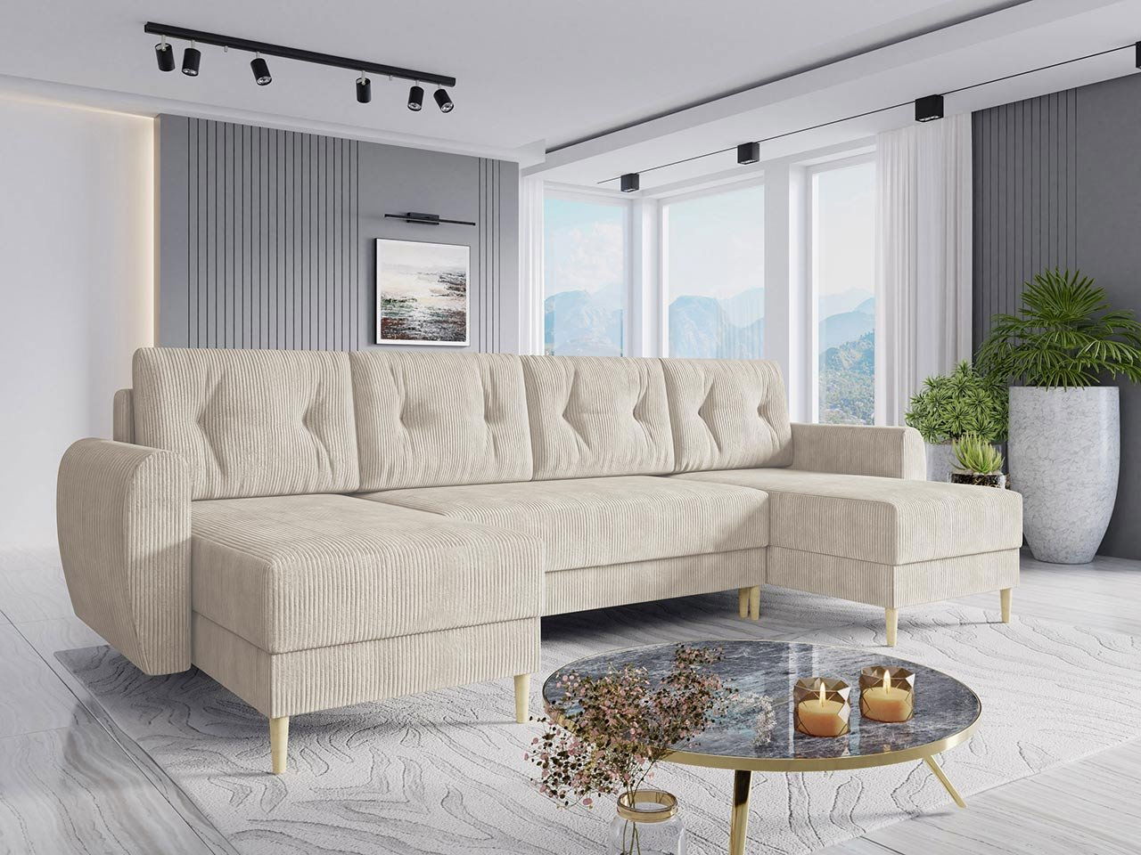 Skandinávský šik v moderním provedení, takto vypadá rozkládací rohová sedačka Keklat US! Žebrovaná látka, kterou je čalouněná, je mimořádně měkká a zvyšuje komfort používání. Sedačka ve tvaru U nabízí relaxační prostor pro celou rodinu a hosty navštěvující dům. Je to také skvělá možnost pro každodenní relax. Rohová sedačka s funkcí spánku má úložný prostor na ložní prádlo, do kterého se vejde peřina a polštáře. Skandinávský styl se odráží v jednoduchosti tvaru a elegantních vysokých nohou. Rohová sedačka do obývacího pokoje Keklat US je praktickým řešením pro každou příležitost!