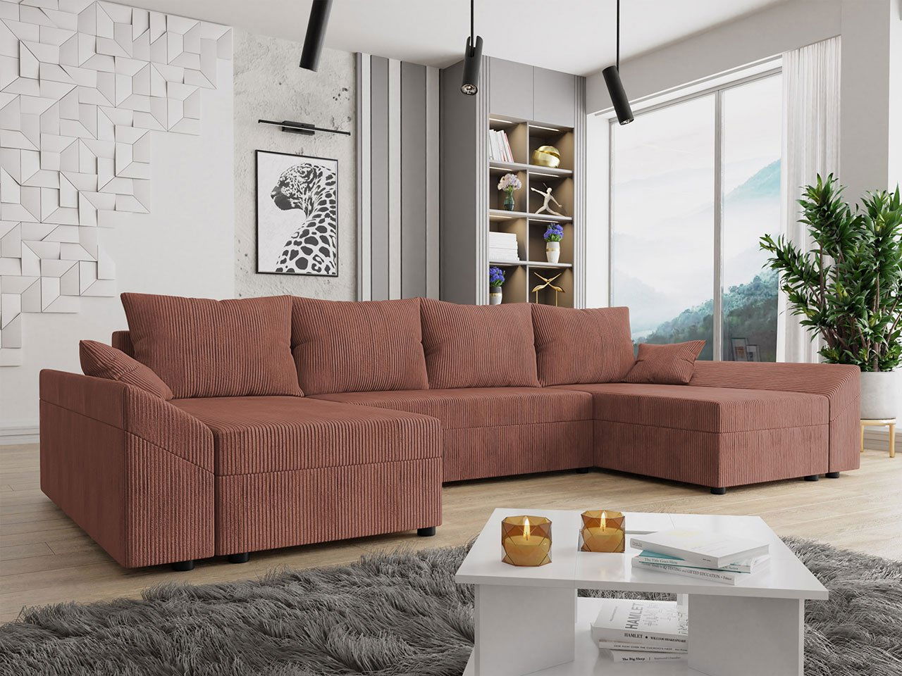 ZobrazitModerní a mimořádně pohodlná rohová sedačka Poltosa U promění váš interiér! Je potažena měkkou a na dotek příjemnou pruhovanou látkou, která celému kusu dodává jedinečný charakter. Manšestrová rohová sedačka se stane ústředním bodem vašeho domova a zajímavou ozdobou vašeho obývacího pokoje. Po rozložení se změní na pohodlnou postel na spaní pro dvě osoby. Velký úložný prostor na ložní prádlo úspěšně zorganizuje prostor a všechny přikrývky, deky a polštáře budou mít jedno konkrétní místo. Opěradlo rohové sedačky s funkcí spaní Poltosa U je tvořeno měkkými polštáři, které poskytnou odpočinek zad unaveným po dlouhém dni. Dvě polohovatelná křesla vám poskytnou výjimečnou relaxaci při sledování filmu nebo trávení času s rodinou.