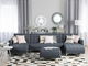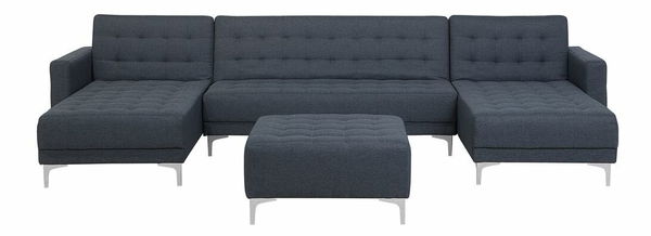 Modulární sedací souprava ve tvaru U s taburetem je ideálním a skutečně univerzálním kusem nábytku do vašeho obývacího pokoje. Souprava se skládá z 3-místné pohovky a dvou bočních lehátek a díky nastavitelnému opěradlu ji lze jednoduše změnit na pohodlné lůžko. Tato souprava je celá čalouněná vysoce kvalitní a stylovou tmavě šedou látkou s elegantním prošíváním a nabízí funkčnost i nadčasový styl. Celá sestava je stabilní díky kovovým nohám.