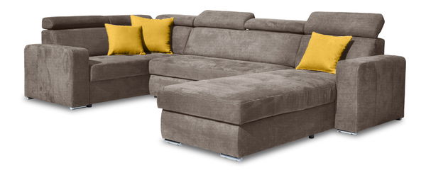 Rohová sedačka ve tvaru U FX 15 (hnědošedá) (P) je pohodlná a lákavá na relax, příležitostné spaní nebo posezení s přáteli. Je vyrobena z tkaniny Diosa 19 a má funkci rozkladu s plochou spaní 281x125 cm. Tento produkt má také úložný prostor o výšce sedáku 43 cm a hloubce sedáku 55 cm. Sedačka má nastavitelnou opěrku hlavy a je vybavena vlnitými pružinami a čalouněnými pásy jako součást konstrukce. Nohy jsou z chromu a v ceně jsou 2 polštáře (55x55 cm a 45x45 cm). Tento produkt dodáváme v demontu a barva taburetky na Vašem monitoru se nemusí shodovat se skutečným barevným provedením produktu.