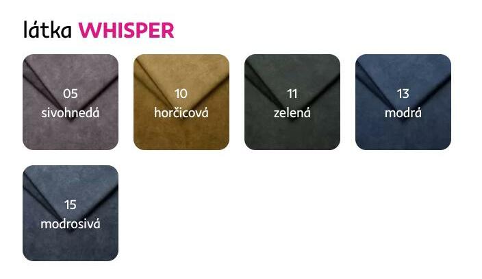 Velurová tkanina Whisper je příjemná na dotek a dostupná v bohaté barevné škále. Materiál se vyznačuje jemným stíněním, které mu dodává zajímavý efekt. Obsahuje speciální stabilizační podložku, která zesiluje tkaninu a zabraňuje nežádoucímu natažení. Tato tkanina na čalounění je velmi odolná a charakterizuje se vysokou odolností vůči opotřebení, což ji činí ideální na tapicerovaný nábytek jako jsou pohovky, pufy, křesla nebo čela postelí.