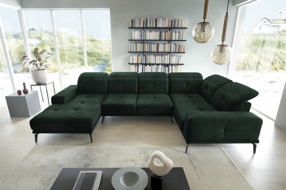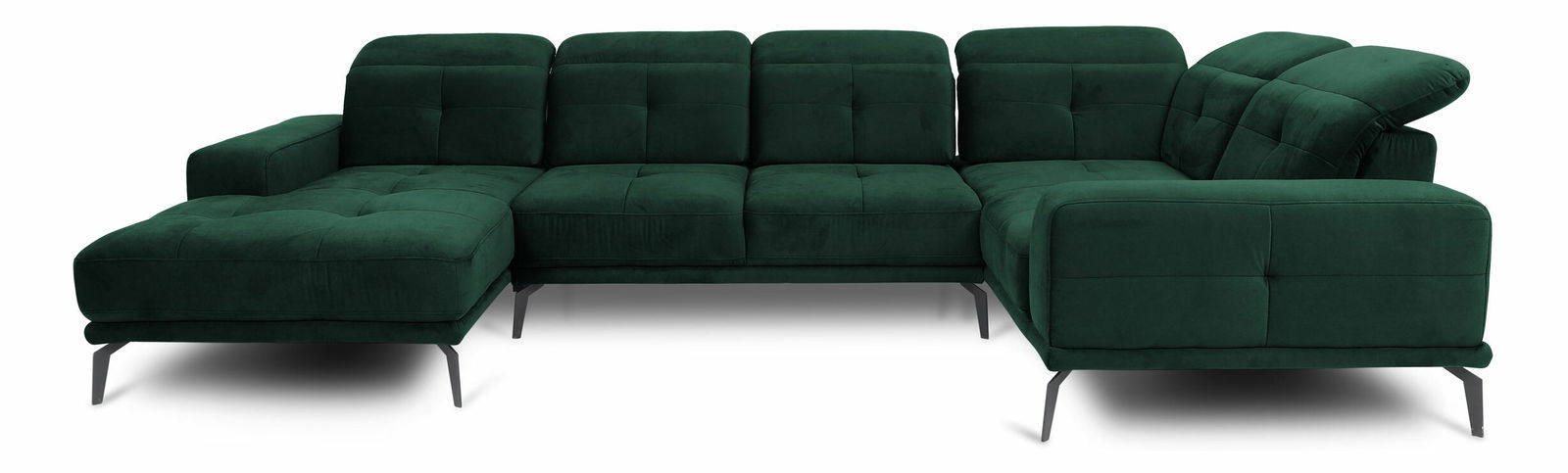 ZobrazitRohová sedačka ve tvaru U Nicolette (tmavě zelená) je dokonalá volba pro ty, kteří hledají pohodlné a stylové řešení pro svůj obývací prostor. Sedačka má mírně vyvýšený sed a ergonomické opěrky, které zaručují maximální komfort. Tkanina Loco 35 zaručuje pevnost a odolnost a je velmi jednoduchá na údržbu. Korpus je vyroben z borovice, což zaručuje pevnost a odolnost celé konstrukce. Materiál výplně je HR pěna, která zajišťuje dlouhou životnost sedačky. Sedačka má šest míst k sezení a zapuštěná ramena, která přidávají na její elegantnosti. Menší detaily, jako černá ocel nožiček a nastavitelné opěrky hlavy, činí z této sedačky perfektní kousek nábytku pro Váš domov. Dodáváme v demontu.